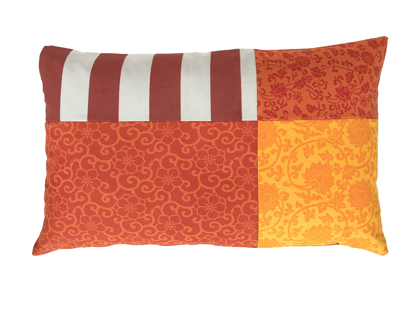 Wir haben hier 4 handbedruckte Stoffe zu einem anmutigen schönen Kissen kombiniert. Die Farben werden in unserer Werkstatt entwickelt und mittels Siebdruck auf den Stoff gedruckt. So entstehen immer wieder tolle neue Musterstoffe, die wir in unseren Kissen verarbeiten. Die Zusammenstellung der Farben gibt diesem Kissen hier einen warmen strahlenden Ausdruck. Die ausgewählten Farben sind aus einer Farbwelt.